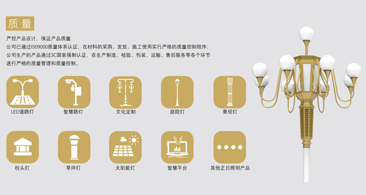 公司秉承創(chuàng)新、開(kāi)拓精神,把握市場(chǎng)需求,不斷推陳楚新,吸取國(guó)內(nèi)外同行先進(jìn)的制作技術(shù)、加工工藝和經(jīng)營(yíng)理念。憑借雄厚的資金實(shí)力、完善的生產(chǎn)能力、優(yōu)秀的專業(yè)人才、過(guò)硬的產(chǎn)品質(zhì)量,積極參與國(guó)內(nèi)外城市道路、加工工藝和經(jīng)營(yíng)理念。憑借雄厚的資金實(shí)力、完善的生產(chǎn)能力、優(yōu)秀的專業(yè)人才、過(guò)硬的產(chǎn)品質(zhì)量,積極參與國(guó)內(nèi)外城市道路、旅游景區(qū)、房地產(chǎn)小區(qū)照明等建設(shè)工程,銷(xiāo)售網(wǎng)絡(luò)遍及全國(guó)各地...